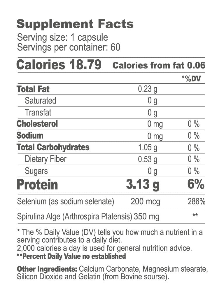Selenium + Spirulina contiene selenio en forma de selenito de sodio (200 mcg) y polvo de Arthrospira platensis (350 mg).